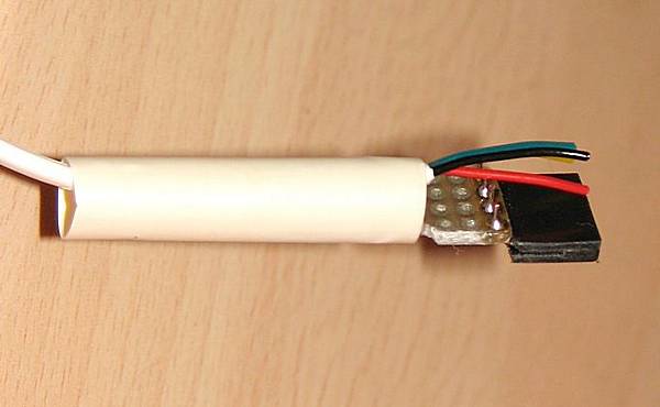 A készülékeimhez szeretem használni a telefon vezetékeket, mert dekoratív és jól hajlik, de nem annyira, hogy hajlamos legyen gubancolódásra. Vagy 2-3 cm hosszban csupaszoljuk le. Egy darab zsugorcsövön átbújtatva, toljuk be mellé a panel nyelét. Figyeljünk oda, hogy a vezeték a forrasztás felöli oldalon legyen.