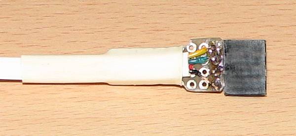 Hőlégfúvóval megkezelve szépen rásimul a kábelre, illetve a panel nyelére. Hőlégfúvó hiányában használhatunk egy-két szál gyufát is, de akkor célszerű fekete zsugorcsövet használni :). A zsugorcső a kábelt meglepően szorosan a panelhez fogja. A túlnyúló része törésgátlóként funkcionál. Most jön a macera. Csípő fogóval megfelelő hosszúra le kell csupaszoljuk a vezetékeket. Kézzel sodojuk össze őket, ónozzuk elő. A vezeték végét csipeszbe fogva a megfelelő lábhoz fektetessük oda, forrasszuk, majd vágjuk le a tullógó véget. A telefon vezetéket nem forasztáshoz tevezték (hanem krimpeléshez). Sajnos a képen jól látszik, hogy elkövettem azt a hibát, hogy hőlégfúvás után nem vártam meg, hogy lehűljön a vezeték. Csupaszolásnál a fekete vezeték szigetelése csúnyán megnyúlt. Érdemes denaturált szesszel lemosni a forrasztásról a ráégett folyasztószert.