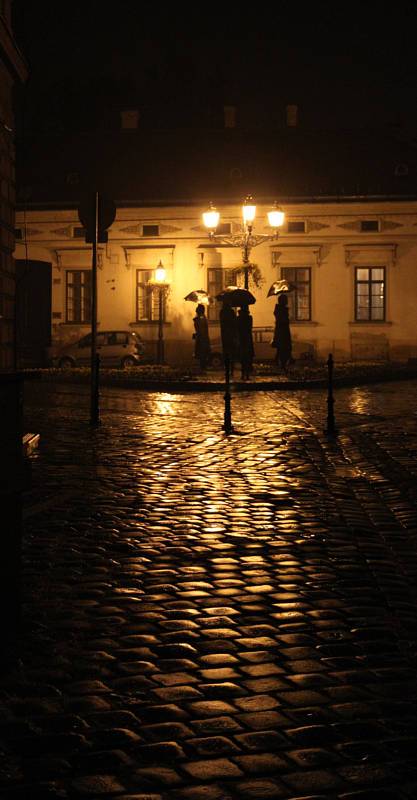 Igazából ezért indultunk el feleségemmel, hogy lefotózhassam az esernyős szobrokat. Nyáron, ragyogó napsütésben, virágokkal körbeültetve, pontosan erre a nyirkos, esős, már-már hideg, késő őszi estét idézi elénk ez a szoborcsoport. De nyáron ki akar erre gondolni?