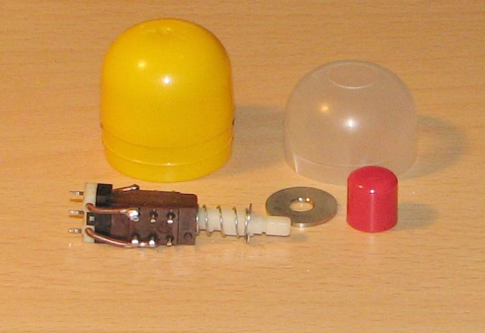 Egy isostat kapcsolóra két rézdrót segítségével hozzáforrasztottam egy egérből kibányászott mikrokapcsolót. Az volt a hátránya, hogy az isostat kapcsoló nem kattant benyomott helyzetben, csak a mikrokapcsoló kattant exponáláskor. A kapcsoló tengelyére rátettem egy nagyobb alátétet, és így került rá a gombsapka. Keresgettem dobozkákat, végül a fiamtól kértem egy Kinder tojást. Egyik végére fúrtam egy megfelelő méretu lyukat, amin keresztül kiállt a gomb.